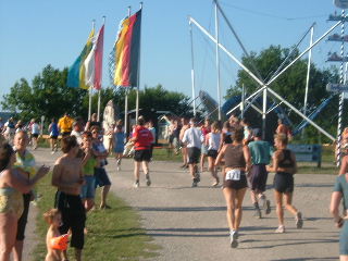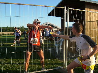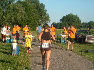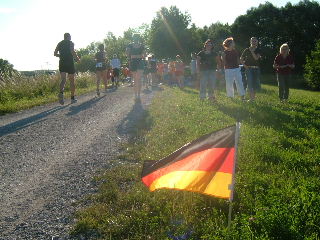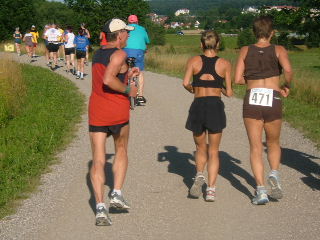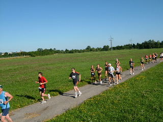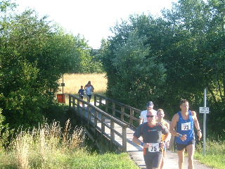 @Erwin: Wir beginnen die kleinen fiesen spitzen Steinchen am Weg deutlich zu spüren. Unsere Füße sind müde. Wir überqueren die kleine Holzbrücke und verlassen den See wieder. Es geht langsam gegen Ende, ich verschiebe meinen Wunsch im See abzutauchen auf 2007 und beschließe ein paar Läufer zu motivieren. Ich erzähle einen 1km-langen Papageien-Witz, startend bei km18. Das lenkt die 8 Mitläufer um mich ab von Ihren müden Beinen und ausgetrocknetem Körper. Jungs und Mädels, ...