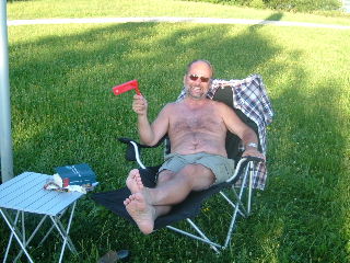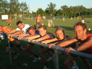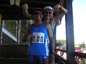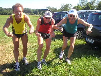 kräftige Runde, es gibt viel zum Erzählen. Jetzt noch in der nicht mehr so warmen Abendsonne die Dehnübungen machen und langsam verschwinden sowohl die Sonne als auch wir wieder. Manche im Zelt bei Weißbier und Bratwurst, andere zum Auto und Abendessen zuhause... Unsere Geschenke (die übrigens jeder Starter für die nur € 15,00 erhält) nehmen wir gern mit: ein Weizenglas "Altmühlsee", Duschbad, Deoroller. Und Erwin ist doch nicht ins Wasser gegangen... |
