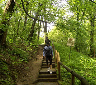Er ist sehr steil, so dass wir ein Stück gehen - Der Nürnberg-Marathon vom letzten Sonntag steckt uns doch allen noch in den Knochen. Oben auf der Böttigerpromenade tummeln sich links einige Rehe im Gatter und rechts geht es steil hoch zum Burgberg. Nach ca 100m geht es wieder talwärts in Richtung Rudelsweiherstraße. Dort angekommen queren wir die Talsohle und folgen dem Tal in Richtung Quelle. Von nun an geht es durch dichten Kiefernwald stetig bergauf, an aufgelassenen Teichen vorbei. Oberhalb des Waldkrankenhauses über die Straße nach Rathsberg, nun wird es wieder steiler und müssen einige Schritte gehen. Endlich haben wir den ersten Berg (ca. 120 Höhenmeter) bewältigt. Wir sind oben an der Albabbruchkante in Rathsberg angekommen. Vom Waldrand haben wir nach rechts eine wunderschöne Aussicht auf die neu angelegte Reitanlage des Rathsberger Pferdesportvereins und auf der anderen Seite auf den steil abfallenden, felsigen und bewaldeten Albrand. Wir laufen ein Stück längs der Reitanlage bis zur Höhe des Rathsberger Schlosses. Nun geht es wieder etwas bergab in die Erlanger Wildnis. Hier wird der Weg sehr eng und ist an einigen Stellen vom Regen der letzten Tage so rutschig, dass wir vorsichtig gehen müssen, um nicht auszurutschen. Jetzt noch über ein ausgewaschenes Bachbett. Glücklicherweise gab es schon jemanden, der vorher einige Stufen in die Böschungen eingegraben hat. So lässt sich diese Hürde doch gut meistern. Da plötzlich taucht noch eine kleine Schlucht auf, die man zwar gut herunter laufen kann, aber nur mit viel Schwung auf der Gegenseite wieder hochkommt. Ich wage mich als erster durch die Schlucht und schaffe es gerade noch die Anhöhe zu erklimmen. Anne kann ich noch den letzten Meter hochziehen, aber Thomas rutscht den Hang wieder zurück in die Mulde, er kommt einfach nicht hoch. Aber einige Meter weiter kann er den Hang, der dort etwas flacher ist, hochklettern. Nun haben wir den schwierigsten Streckenabschnitt bewältigt. Wir freuen uns auf die Pause, die wir auf dem Parkplatz der Gaststätte Schloss Atzelsberg, wo ich mein Auto vorher abgestellt habe machen. Dort gönnen wir uns eine kleine Erfrischung. Es geht weiter durch Atzelsberg und den Märchenwald über breite Wege wieder abwärts. Die Schleife um den Schwanenweiher sparen wir uns. Jetzt wieder stetig bergauf durch Adlitz bis hinauf zur Marloffsteiner Höhe. Super Aussicht! Nach Norden genießen wir den Blick weit ins Regnitztal bis nach Forchheim und die Fränkische Schweiz. Im Süden liegt uns Nürnberg mit der Burg und auch der Moritzberg zu Füßen. Dem Höhenrücken folgen wir bis fast nach Rathsberg, um dann durch den Meilwald (ein wunderschöner Mischwald) bergab bis an die Schwabach zu kommen. Hier gibt es noch gefasste Quellen, an denen sich Thomas erfrischt. An der Schwabach entlang laufen wir auf dem Hochwasserdamm bis zur Ausgangstelle, dem Bärengarten zurück.