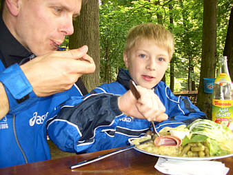 Sonntag. Tag der langen Läufe. Gudrun hatte sich für einen Filzkurs angemeldet. Ihr habt richtig gelesen! Und somit waren wir Männer heute allein. Ich wollte aber auf meinen langen Lauf nicht verzichten. So habe ich schon letzte Woche Jonas eine Radtour zum Roppelt Keller nach Stiebarlimbach angeboten. Jonas ist für seine 9 Jahre schon topfit. 30 km auf dem Rad sind für ihn „easy“. Na dann mal los!„Papa, wann bist Du endlich fertig? Ich will los!“ Wir starten bei uns für der Haustür. Über Hemhofen und Zeckern geht es zur B 470. Die überqueren wir und sind fortan im Wald. Leicht bergab führt der Weg an mehreren kleinen Weihern vorbei direkt nach Weppersdorf. Von meinem Coach bekomme ich immer den KM-Stand und die Geschwindigkeit gemeldet. „Papa, du bist ganz schön schnell. Das muss ich dir sagen!“ Dieses Alter ist einfach wunderbar. Der Papa ist immer der Größte. Über Lauf und Haid geht es nach Willersdorf. Hier biegen wir links ab. „Stiebarlimbach 2 KM“, steht angeschrieben. „Papa, wann sind wir da?“ Sind das die ersten Ermüdungserscheinungen? Im Gegenteil, beim Anstieg zieht er mich hoch und nach 14 KM und 70 Minuten kommen wir am Keller an. Pünktlich um 12 Uhr zum Mittagessen. Das ist wie immer deftig, fränkisch. Auf Schweine-, Sauerbraten oder Ente habe ich aber keine Lust. Wir wollen anschließend noch 20 KM weiter. Also bleibt uns Sportlern nur der große Salatteller mit Schinken und Ei. Was heißt da nur? Der ist riesig und langt für uns zwei. Für 4,10 € echt klasse. Die Radlerhalbe und die Apfelschorle je 1,60 €, da kann man nicht meckern. „Papa, wann geht es weiter?“ Wir füllen unsere Getränkeflaschen auf und machen uns wieder auf den Weg. Zurück nach Willersdorf in Richtung Wald. Am Willersdorfer Keller (Der ist auch sehr zu empfehlen!) vorbei Richtung Oesdorf. Hier haben wir einige Höhenmeter zu überwinden. Die Orientierung fällt uns etwas schwer, die Ecke ist für uns Neuland. „Papa, wann kommen wir wieder aus dem Wald raus?“ „Bald mein Sohn!?“, klang wohl nicht so überzeugend. Wir treffen ein nettes Radlerehepaar und können uns gegenseitig helfen. Wir weisen sie Richtung Willersdorfer Keller, dafür zeigen sie uns den Weg Richtung Oesdorf. „Papa, warte doch. Wann hört den der Berg auf?“ Ist ja klar, an Steigungen bin ich im Vorteil. Und hier geht es aber stramm nach oben. Als alter Rennsteigveteran freue ich mich natürlich, aber mein Sohn……. Wir folgen dem Wegweiser Richtung Adelsdorf und lassen Oesdorf links liegen. Ich will über Poppendorf nach Hemhofen und von dort weiter auf meiner Hausstrecke zur Roten Marter. Wieder vorbei an Weihern, Reiter hoch zu Ross, Spaziergänger und Walkern am Wiesenrand. Die haben ihre Stöcke in den Boden gerammt und ihre Shirts darüber gespannt. So liegen sie im Schatten. Die 30 KM-Marke wird von uns geknackt. „Papa, wann sind wir endlich zuhause?“ Meinem Sohn tut langsam der Hintern weh. Kein Wunder nach 3 Stunden im Sattel. Aber ich bin auch froh, wenn wir gleich daheim sind. „Noch 4 Kilometer! Dann machen wir uns erst Mal ein großes Eis. Wie viel Kugeln willst Du?“ Nach 3 Stunden und 23 Minuten sind wir am Ziel. 39 Kilometer und wir fühlen uns gut! Um 10.20 Uhr waren wir gestartet, um 15.00 Uhr waren wir daheim. Die Dusche ist eine Wohltat und das Eis schmeckt uns besonders gut! Keep on running und denk dran: DO THE RIGHT KNOT! Jochen Brosig Röttenbach, den 25. Juli 2005 |