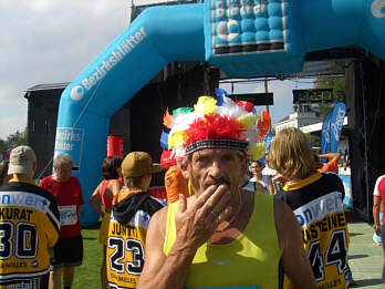 Flott durch die Wachau - Fluss abwärts bis ins ZielEin wunderbares Wochenende hatten wir beim Halbmarathon entlang der Donau. 9.300 Teilnehmer waren bei diesem Landschaftslauf auf den Beinen. 5400 davon auf der Halbmarathonstrecke. Brigitte, Gerlinde, Margret, Uschi, Walburga, Manfred und ich mittendrin. Der Wachau-Marathon zählt sicher zu den schönsten Marathonläufen in Österreich, führt er doch von Melk über Spitz an der Donau durch die Wachau bis Krems. 10 KM-Lauf, Halbmarathon, Marathon und ein Ultralauf über 53 KM wurden angeboten. Bestzeiten waren an diesem Wochenende in keinem Wettbewerb zu erwarten. Ein Wetterumschwung durch Fön und ein starker Wind während des Rennens machten diese Hoffnungen zunichte. Jedoch eine Frage muss erlaubt sein: Muss es denn immer eine Bestzeit sein? - Natürlich nicht. Die Organisation ist gut. Mittels Bustransfer vom Parkplatz zum Bahnhof und weiter mit dem Zug kommen wir an den HM-Start nach Spitz. Der Ort platzt aus allen Nähten. Die Dixies reichen nicht aus. (Foto) Was wird wohl 2006 für ein Jahrgang? Ich ahne schreckliches für die Wachauer Winzer. Die Stimmung ist wunderbar trotz kühler Temperaturen. Start ist überpünktlich und gleich am Anfang geht es leicht bergab. Angespornt durch die zahlreichen Zuschauer läuft ein jeder an seine Leistungsgrenze. Vorbei an den Heurigen-Wirtschaften und unterstützt durch zahlreiche Bands führt der Weg nach Krems. Die Wachau, schließlich Weltkulturerbe, wirbt nicht zuletzt mit dem Slogan „Eine der schönsten Flusslandschaften Europas“. Und das ist nicht übertrieben. Auf den letzten Metern werden wir auf einer Welle der Begeisterung getragen. Die Zuschauer bilden auf den letzten hundert Metern eine schmale Gasse bis zum Ziel. Das ist im Stadion. Dort werde ich von Häuptling "Qualmende Socke" empfangen. (Foto) Mittlerweile lacht auch die Sonne. Es ist sehr warm geworden. Die Verpflegung ist auch gut. Massagen gibt es. Was will das Läuferherz mehr? Die Gesamtwertung: an diesem Tag dominieren die Schluchties. Rot-Weiß-Rot strahlt im Ziel. Jedoch in der Altersklassenwertung sind unsere Großenseebacher Vertreter ganz stark und lassen dabei den Großteil aller Starter hinter sich. Brigitte und Margret auf Platz 1. Margret ist nach zweijähriger Wettkampfpause sofort wieder ganz stark und macht dort weiter, wo sie aufgehört hat. Platz 1 in der W65. Seit über 15 Jahren für das Langstreckenteam aktiv, sammelt Margret beständig Erfolge. Ihre Erfolgsbilanz ist beeindruckend: In der Wachau steht sie zum 100. Mal ganz oben auf einem Treppchen. 39 Mal erlief sie Platz 2 und 11 Mal wurde sie Dritte. Wie immer kam sie auch in Krems lächelnd ins Ziel. Kaum angekommen, spricht sie schon davon, dass sie doch lieber den Marathon hätte laufen sollen. Nebenbei absolvierte ich dabei meinen 100. Wettkampf für das Langstreckenteam. Manfred seinen 200. Im stark besetzten Läuferfeld siegte der Ukrainer Sergij Zachepa in 1:05:55. Sein Kommentar zum Wetter: „Macht nichts, die Strecke ist doch super!“ Heute Abend geht es zum Heurigen. Der krönende Abschluss für dieses Wochenende. Prost! Morgen haben wir etwas Kultur eingeplant und besuchen Stift Melk. Run happy! Jochen Brosig Internet: www.wachaumarathon.at www.langstreckenteam.de |