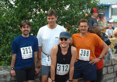 ![]() 4. Tour de Hesselberg (Halbmarathon), 09.06.2002Gutes Laufwetter, einige Steigungen, tolle Blicke in die weite, grüne Natur FrankensHallo Läufer! Also dass sich das mit der Tour de Hesselberg noch nicht herumgesprochen hat! Ein Geheimtipp, wirklich. Es ist eine richtig gut organisierte junge Veranstaltung, und für die ganze Familie. Die Organisatoren reißen sich ein Bein aus für uns und es gibt prima Geschenke für jeden. Für jeden! Und es ist wirklich was geboten am Sonntagmorgen: Hüpfburg, Lauf-Outfit zum kaufen, gutes Essen vor und nachher, geführte Aufwärmübungen für alle vor dem Start, Aerobic-Vorführung, Ausstellung lokaler Maler und Künstler... Es geht vom Start weg einige km leicht bergauf, im Uhrzeigersinn um den schönen Hesselberg. Die Wege sind breit und fast ohne Autos. Die Verpflegung unterwegs ist prima. Die Strecke ist gut ausgewiesen. Alle 2,5km zeigt sich ein kleines weißes Schild... - 2,5km, das ist gewöhnungsbedürftig! Ich finde 1km-Markierungnen besser. Ob das mit der Währungsumstellung zu tun hat? Rechtzeitig vor dem Start treffen wir vier uns, Stefan, Jürgen, Ernst und ich. Wir machen Gymnastik und ich beschließe, heute mit Jürgen zu laufen. Wir kannten uns schon ein bisschen, aber jetzt noch besser, weil wir uns im Verlauf alles Mögliche erzählen, bergauf und bergab. Ziemlich bald hat sich Manfred zu uns gesellt, der seinen Trainingslauf mit dem Event heute zusammenlegt. Manfred kenne ich ein bisschen vom Sehen. Auch wir plaudern angeregt. Das ist das Schöne an einem solchen kleinen Lauf: man lernt wirklich Leute kennen. Okay, am Sonntagmorgen stehen keine großen Mengen von Leuten am Straßenrand. Aber dafür um so herzlicher gucken die zurückhaltenden Franken uns Läufern zu in den kleinen Ortschaften. Es ist ein prima Gefühl, irgendwo zwischen ruhig alleine durch die Gegend laufen, ganz familiärem Applaus und wirklich wer sein für den alten Bauern und die Bäuerin am Gartenzaun. Herrlich! Viel über den Verlauf will ich nicht erzählen, nur ein paar nette Funken vom Straßenrand, die sich mir eingeprägt haben und diesen Lauf so typisch und liebenswert machen: Kinder haben ihren weißen Zwerghasen auf dem Gartentür-Pfosten postiert und der bleibt da andächtig und guckt uns zu. Die Oma sitzt daneben und vergisst aufzupassen, dass das Tier nicht runterhüpft, so sehr begeistert klatscht sie. Eine schwangere junge Mutter sitzt alleine und applaudierend im Klappstuhl, etwas außerhalb der Ortschaft unter einem Obstbaum. Dem Kleinen im Bauch geht es gut, sagt sie und streckt ihren wirklich dicken Bauch in die Morgensonne. Ich scherze, ob es denn an dieser Verpflegungsstation keine Bananen wie an der letzten gäbe? Der alte Herr rennt sofort los: „Wartamal, ich hab noch eine in der Stubn“. (Entschuldigung, Herr... !) Schön war’s! Ich werde es weitersagen... Erwin vom „Team Bittel“ Teilnehmer ca. 150 (je Halbmarathon und Duathlon) Infos: www.tour-de-hesselberg.de und www.hesselberg.de |