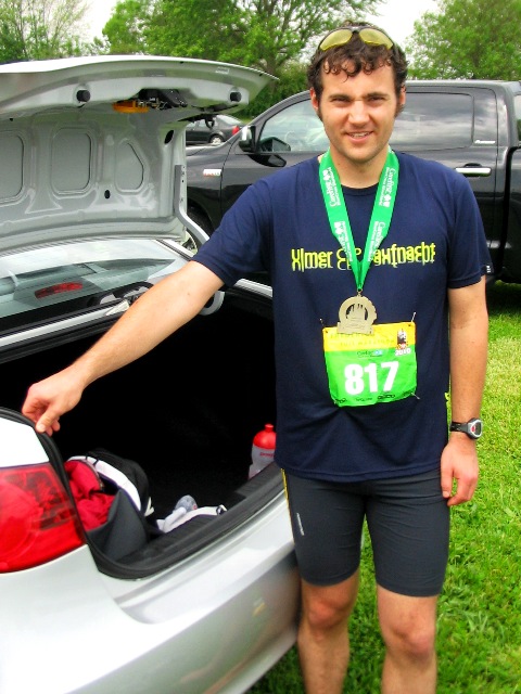 | Finally I ended up with doing my diploma thesis in the United States. But the nice thing about running is: You can do it everywhere without any need for a gym or something like that. Just put on the Running Shirt and Shorts, tie your running shoes and off you go. Well if the environment allows you to do so, as in den first weeks after my arrival, there was still snow up to my waist. I tried it once, but it was not enjoyable - I booked it to "strength training" in my log. But as I do not know when I will ever have the chance to be in the US again, I decided to take part in at least one run here. Preferred date was at the beginning of May as my training plan was setup for that period already. On may 15th there would be the german Mannheim MArathon, I already had signed up for last year, as I did not think about an internship in the US. Once here, I decided to take part in the Marathon in Frederick, a city located 60 miles northwest of Washington DC. Signing up was quite easy and done in a few minutes, although I had to pay 75$ for admission, as early bird special phase was already gone. But who knows, when I will ever have the chance to do it again. Of course I decided to take part in the cream of the crop class: 26.2 miles or 42.195 kilometers. That should not pose any problems to me, as I had done successfully the 100K race "lange Ulmer Laufnacht" in Germany 2009. Mid of March I was ready to commence regular training, as the snow was gone and I had adopted to my area and workplace, so training was scheduled twice a week. Unpreventable the day of the race came closer. I realized it all of a sudden, when an e-mail annouced: 18 day to the start. I was in quite good shape and my training was back up to my usual levels - twice a week between 12.5 miles (20km) and 18 miles (30km), and if I was in the mood sometimes a bit more. Nevertheless I increased training during the last weeks towards the race, mostly at the weekends with an additional relaxed run. A week ahead of the race I took a closer look at the weekend schedule for the run. I was shocked: Pickup of the starter package in the afternoon of May 1st, start of the race at 6:30 am on May 2nd! Overnight stands were quite expensive or even overbooked. So I had the choice - sleep in the car - or drive the 50 miles up to Frederick twice and getting up real early. After pickung ab my package I decided to drive home and get my sleep. For sure this was way more comfortable. After a drive through the night, I arrived at the parkin lot, well organized, Marshallers were directing the traffic so the place was used to maximum. Quickly switching to running clothes in the dark behind the car, setting up the heart rate monitor, and I was ready to start. More and more runners arrived, although it was almost another hour until the start. Enough time to make a short pit stop at the Dixies. Precisely 6:30 am the race was started, slowly the dawn was rising and already know it was pretty warm. First thoughts about taking a jacket I had already abandoned when leaving my car. As I was quite optimistic I took position behind the pacemakers for 3:30h - judging by my training times, this seemed to be quite a realistic goal to reach. The first kilometers (I prefer them as I am more used to them and I had to adopt to the miles sings), respectively miles passed by amazingly quick. The track went trough the inner City of Frederick, and there were always some people along the road cheering at the participants. Everything was ok, my heart rate was a bit higher than expected, but with the high humidity it did not seem to be a reason to be concerned. There are some minor hills in Frederick, but nothing to worry about after all. Soon the track went out into the countryside. I still felt ok, but the heart rate was way to high by now - I tried to reduce my pace, but it would just not affect the heart rate. Just a a bit ahead of the half marathon mark, the organizers had included a dirty trick. Before going through the fairground there was a nasty hill. This was when I first recognized: You are way to fast, not sure why. But half of the race would be done in almost an instant. Again, the track lead toward the city center of Frederick, same road as at the beginning, but this time only a short loop. My body was telling my: Slow down a bit now, otherwise you will probably not make it. But the head succeeded and along the canal the climate was like a refreshing breeze. So now it was crunch-time, back toward the fairgrounds, same road as before, but I this was when I first realized the elevation it climbed and how long it may stretch if you have to run it. I thought, that it would get easier once this obstacle had been passed with less ascending slopes, but it did not. So somewhere after the mile sign for mile 14 I switched to walking. Yes I repeat: Kai (the one who normally knows no pain and always give 110% when running) slows down to walking at a marathon. During the walk I got to know Mark, he did his first marathon and was already drained completely. We set up a team to climb the slope. But what a pity, the track would not get even after that - even worse, it went down to a dip on one side and straight up the hill on the other side. At the same time it came clear - will have to do that one again on our way to the finish line. Forcing ourself uphill, we motivated each other. It was even impossible to think of jogging here. Some guy along the road was very kind and handed us a power bar. Thanks again to the unknown sponsor! Eating was not that much as I am used by other races, I would have eaten some bananas in between for sure. Instead there was only water and iso drinks, a brand thats not well compatible with my stomach. Going down the hill, we started jogging again carefully. By now a third runner joined our team. As we went into the next residential neighborhood, and up another steep hill, we switched back to walking again. This was no longer a reason to be ashamed, many