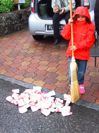 Slalom bergauf zwischen den Bechern, verfolgt vom Ausflugsbus |