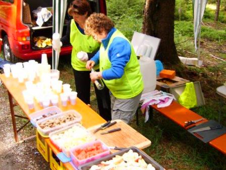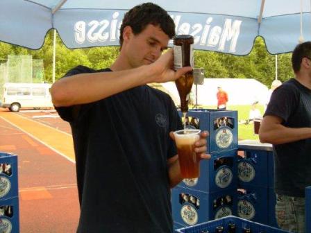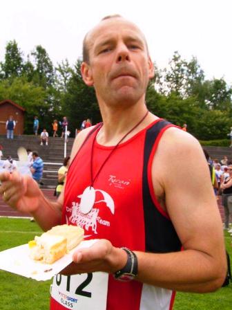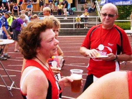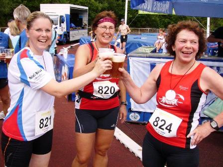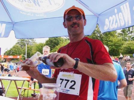 Es wurde über die Zeit zwar warm, aber es gab keine Hitzeschlacht, da Petrus doch noch Wolken vorbeischickte! Zum Ende begleitete ich Teamkollegin Regina ins Ziel und glich erst mal meine "Unterhopfung" mit einem Weizen aus. Da noch einige von uns unterwegs waren, lief ich zurück, um sie anzufeuern und ins Ziel zu schicken. Dort konnte man sich super mit Gerstensaft und selbst gebackenen Kuchen (gegen Spende) verköstigen.