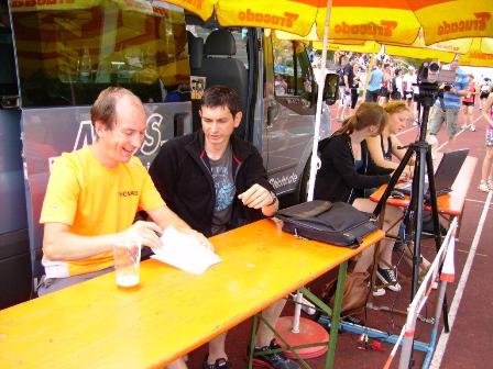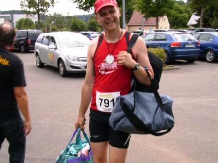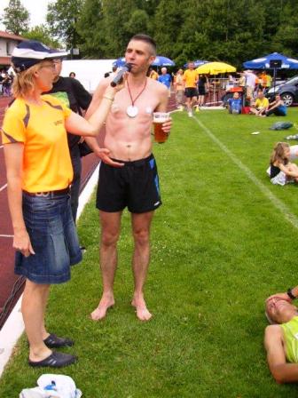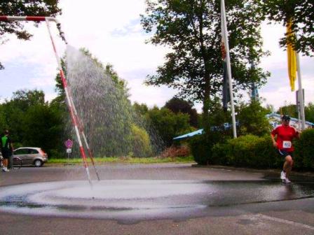 Aha, dachte ich mir dort, als ich die Namen der Marathonläufer hörte. die ins Ziel einliefen: Da sind doch einige, die ich kenne. Wolfgang, Edgar, Anton, Roland, Michael, Thomas... und mein guter Lauffreund Manfred (Team-Bittel)! Seine Frau Heidi empfing ihn obligatorisch mit einem "Ziel-Bier". - So lag ich doch richtig mit dem Gedanken, mehr Bekannte auf der Langstrecke zu haben. Ich erfuhr später von den Problemen des Veranstalters, dass der Zeitnehmer vor einer Woche absprang. Aber ich konnte wie gewohnt unmittelbar im Ziel meine Urkunde ausdrucken lassen und hatte davon nix gemerkt.