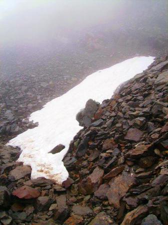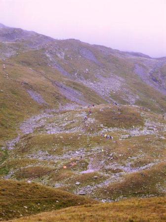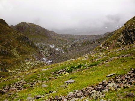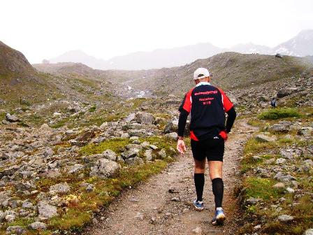 Laufschritt, doch verbirgt Nebel den Blick zum weiteren Aufstieg |