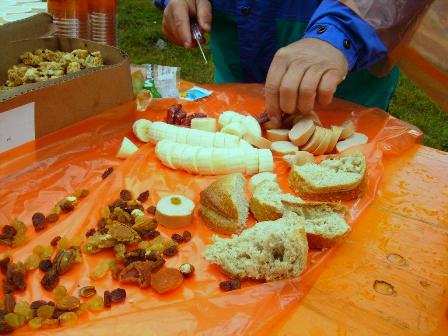 Rosinenbrötchen, Müsliriegel, Bouillon, Wasser und Iso-Tee