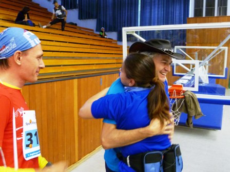 Schnell kühlen wir im Ziel aus, suchen die trockene Sporthalle. Harald