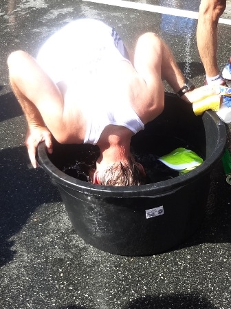 Daniel macht vor wie heiß es heute war: Kopf in die Wanne...