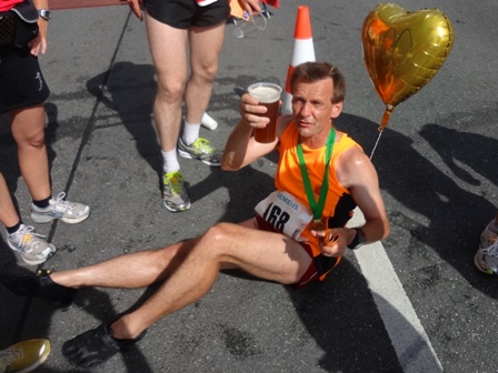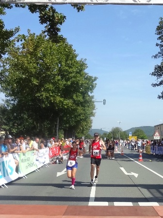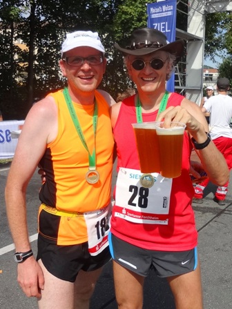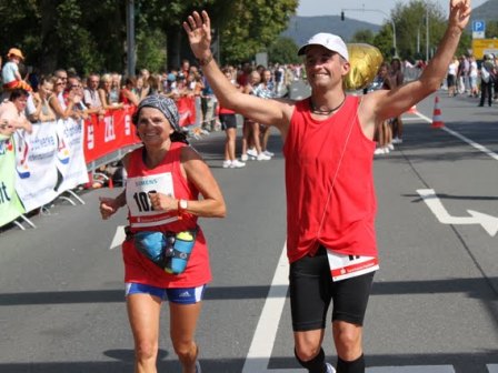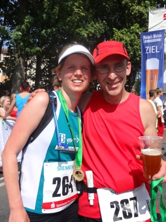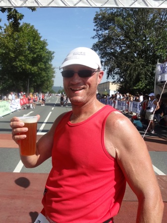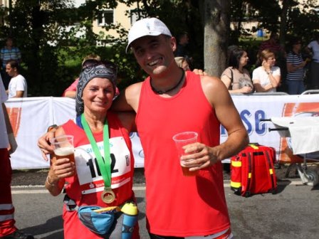 Zugläufer Günter mit dringend nötigem Ziel-Bier und seine stolze Finisherin...