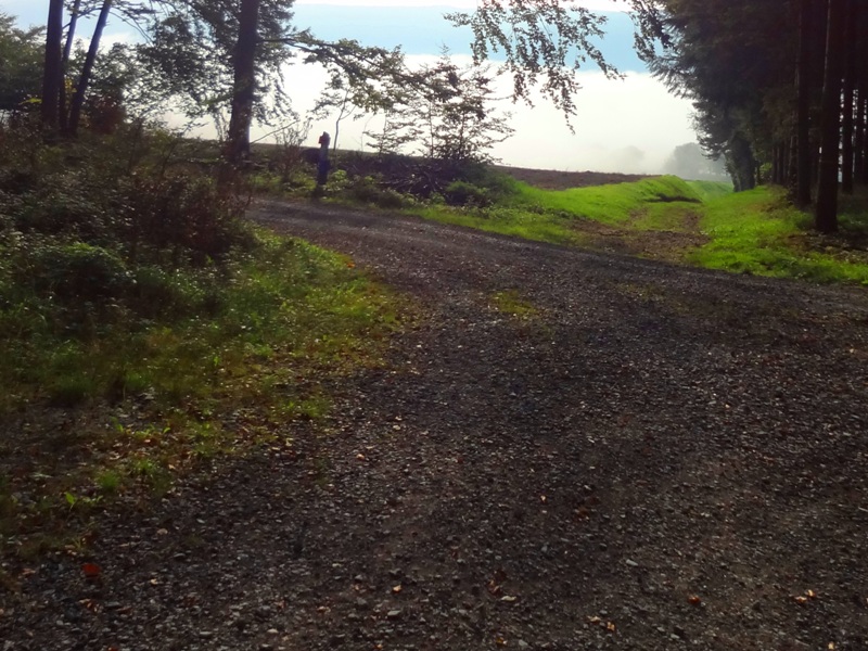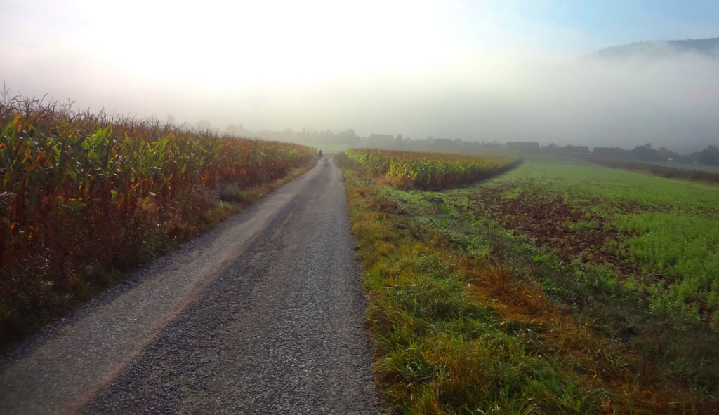 Ich blicke auf die Nebelwand, doch der Weg geht links ab |