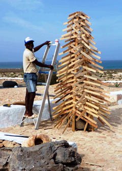 langen hellbraunen Holzstücken zusammengesteckt wird.