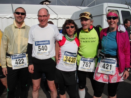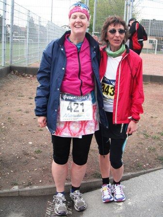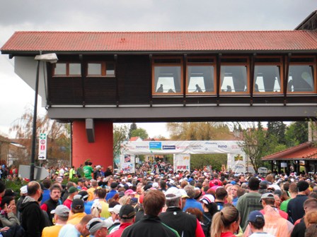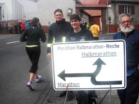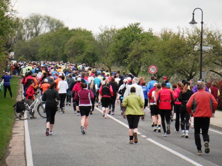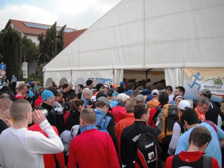 Bereits um 9.00 Uhr sind wir da. Oh, ist das kalt, und ein ständig bedeckter Himmel. Aber kein Regen. Gut. - Ich kaufe mir endlich meinen eigenen Lauf-Chip, gebe den Laufbeutel ab und mein heutiger „Hase“ Erwin macht Fotos. Ja, man kennt ihn auch hier gut, ständig wird er angesprochen. Also Fotos mit Lauffreunden in der Sonne draußen, dann suchen wir schnell wieder das warme Zelt auf. Langsam gehen wir zum Start 200m weiter rüber. Für Halb-  und Marathonläufer geht’s gemeinsam um 10.00 Uhr los. - Wir frieren, es ist ehrlich ziemlich kalt, knapp über 0°C. - Los geht’s! Was für eine Stimmung am Straßenrand! So soll es zum meinem „Geburtstagslauf“ sein! Ein motivierendes Publikum, das (statt Sonntags-Gottesdienst) uns Läufer bejubelt.