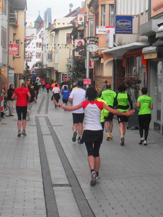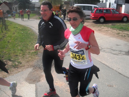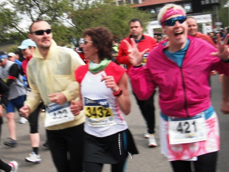 Bei km 8 kommt der Scheidepunkt für HM oder M. Erwin: „Komm Gerti, lass uns knobeln wo wir weiter laufen. Links oder rechts?“ - Gesagt, getan, mitten auf der Strecke, 1 Minute lang: Schnick-schnack-schnuck - Erwin verliert, das bedeutet Halbmarathon. Über unser kleines Spielchen wundern sich die Mitläufer und grinsen. Auch als Erwin schnell noch eine Half-Pipe testet und nach 3 Versuchen und platter Nase aufgibt.