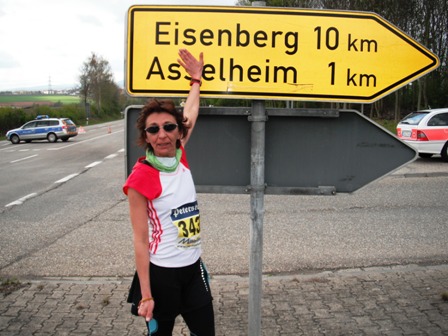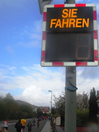 Weiter geht’s immer irgendwie leicht bergauf, bergab. Kurz vor Bockenheim stehen 2 nette Polizisten auf Motorrädern am Straßenrand. Was traut sich die freche glückshormonisierte Gerti: „Wir wünschen eine La-Ola-Welle“. Und tatsächlich, die bekommen wir! - Dankeschööööön! Ich glaube, ich werde noch mal einen Tick schneller. Immer schön weiter so, das rollt ja richtig prima! KM 19, wir überholen weiter eine Menge Läufer - Erwin zählt sie nebenbei.