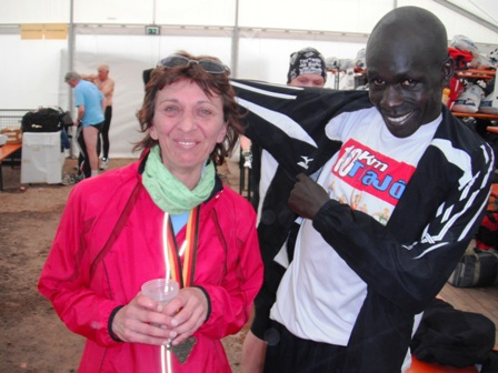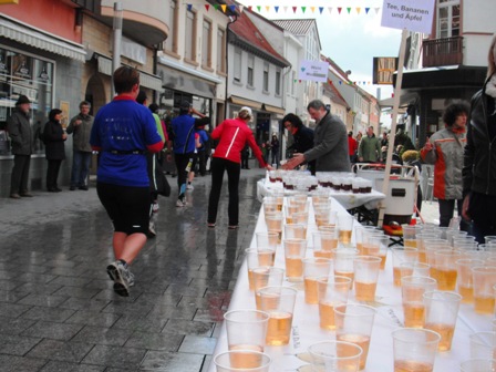 So, jetzt ein wenig essen und trinken (Bier und Wein lasse ich sein): Müsliriegel, Apfelsaft, Wasser. Und lautstark angekündigt kommt der 1. Marathonläufer ins Ziel. Klar, ein Kenianer. - Und ich bin vor ihm!!!