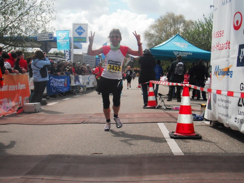 Jetzt die letzten 200 Meter - wir werden tüchtig eingeklatscht – und schon schwupp im Ziel! - Yeah!!!! Was für ein toller Lauf! Ich fasse es nicht, wie leicht das ging. Und das alles trotz der vielen Höhenmeter und dem langsamen Anfang (mit Knobelstopp)… haarscharf an meiner Bestzeit vorbei!!! - Hui, das muss sich erst mal setzen!  Ich bin überglücklich, fertig zum davonfliegen!
