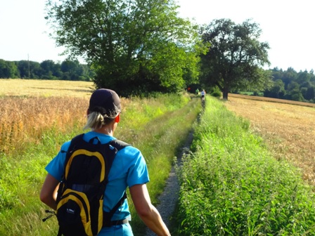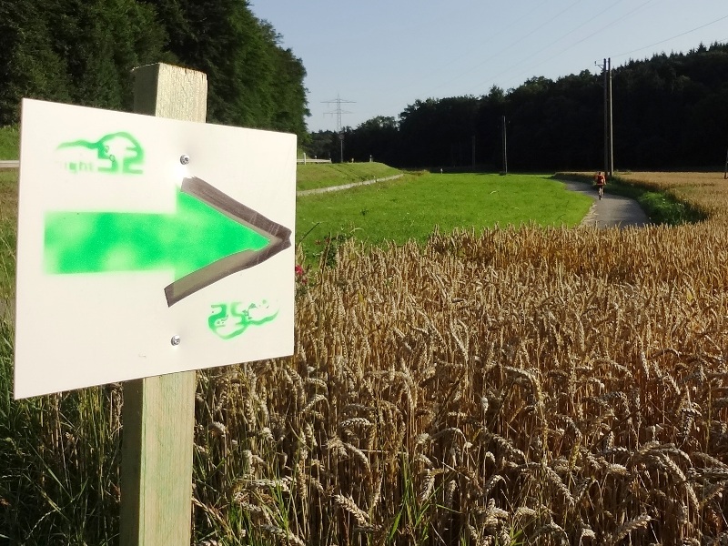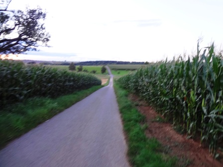 unebener Feldweg, ein paar scharfe Kehren. Uff, gerade noch den Pfeil