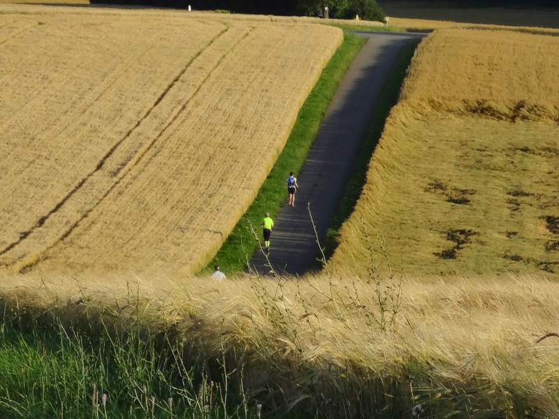 ihr, gemeinsam am Ende des Feldes, langsam los, plaudernd. Hinten laufen