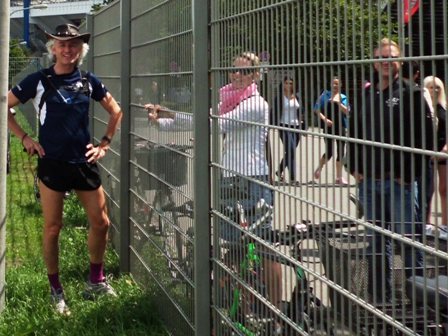 Etwas vor der 1. (und einzigen) Versorgungsstelle, an der "Großen Straße" hörte ich eine bekannte Stimme (männlich), anfeuernd und jammernd weil so viele Frauen vorbeiliefen, und es fürs Anfeuern trotzdem kein Küsschen gab. OK, mal schnell zurückgehoppelt, ein Gnaden-Bussi verpasst und einen verdutzt guckenden Erwin stehenlassen. Und hinter mir eine gröhlende Mädelsmeute mit den Worten: "He, das ist ja Doping". - Doping? OK, für wen? Grins...