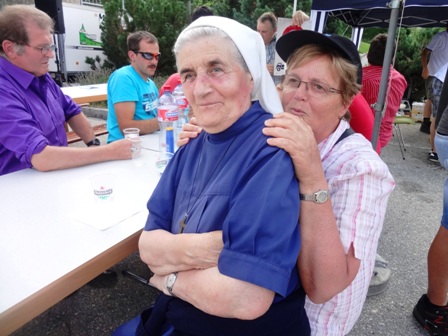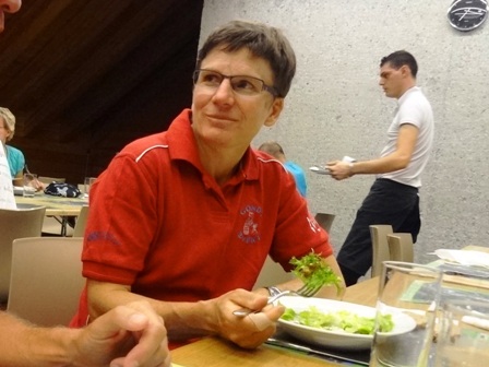 mir sitzt Brigitte Wolf, die Organisatorin. Lustig erzählt sie auf