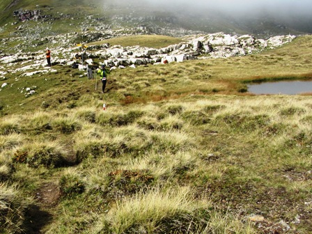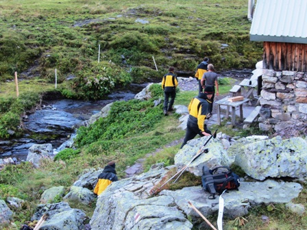 neben ihren großen Rucksäcken auch noch die Markierungshölzer zu tragen,