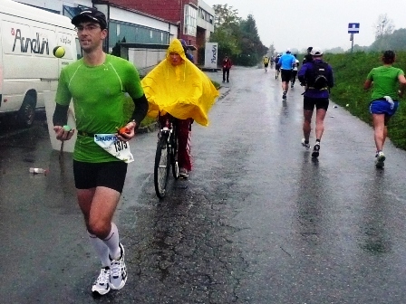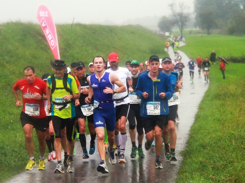 1. Hälfte ist nass, wir laufen immer exakt im perfekten 3:30er Schritt.