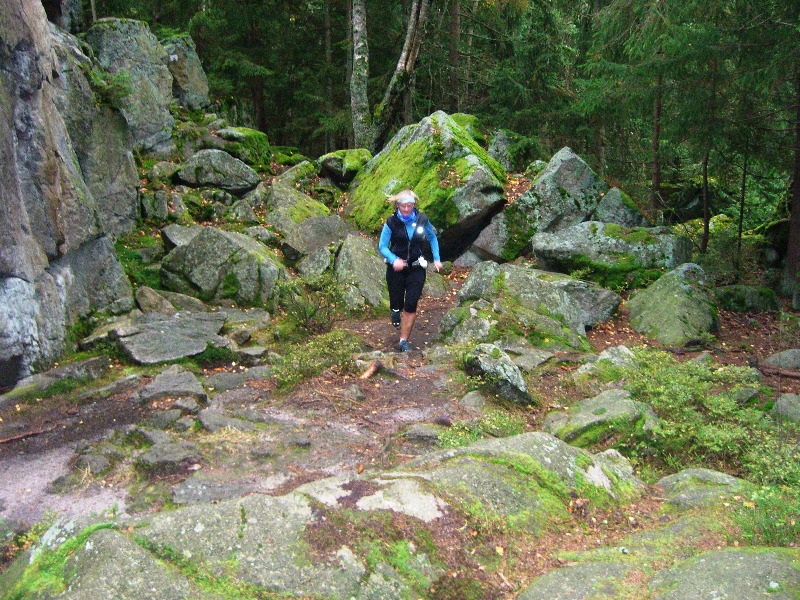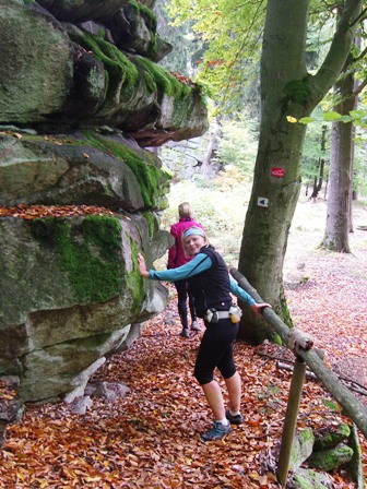 Auf felsigem Blockwerk wird der Räuberfelsen umrundet