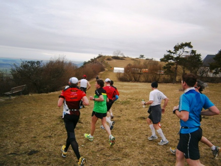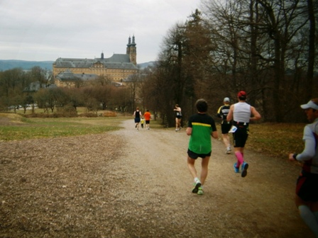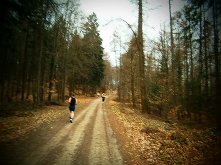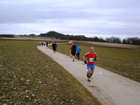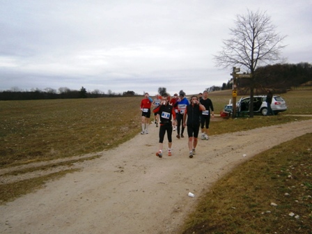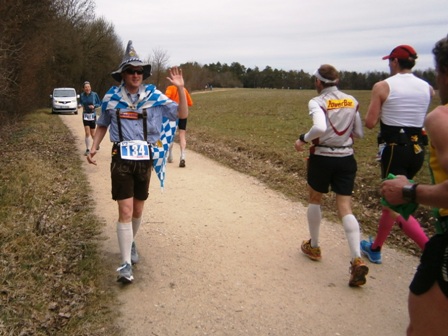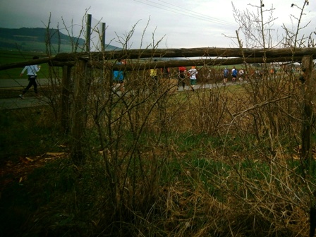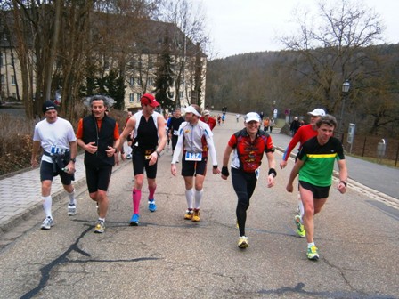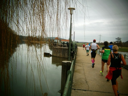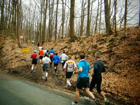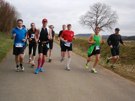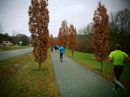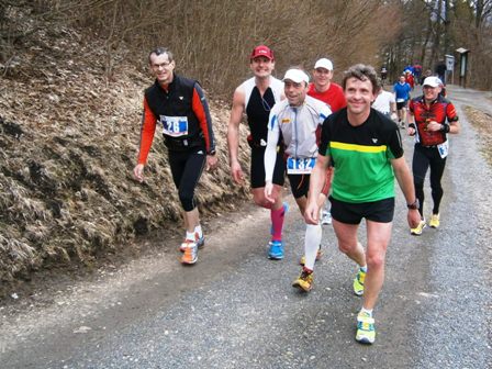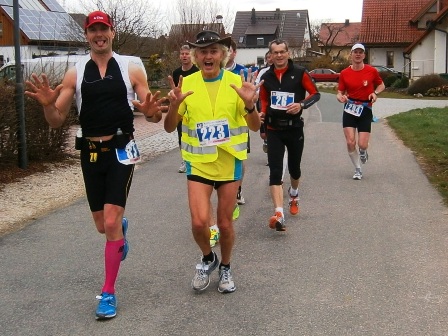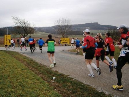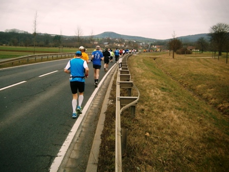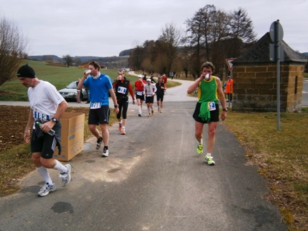 Es ist sehr selten, dass ein Zugläufer am Ende noch eine richtige Gruppe um sich hat. Heute ist es aber so. Zwar mit strengem Regime, aber lustig und erzählend führe ich uns durch die 3 Anstiege bis zum Staffelberg (Hälfte). Wir laufen ruhig wie die Nürnberger Bahnhofsuhr und wir bleiben fest zusammen. Bis km35, dann schicke ich 2 vor, die laufe noch so locker. Ein paar von uns  machen einen halben Schritt langsamer. Und die 6 um mich bleiben eng zusammen, auch wenn’s jedem schwer fällt. Ich erzähle ein paar Witze, so werden auch die faden Geraden erträglich.