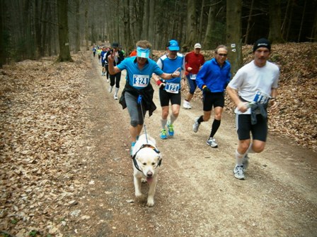 Km4: Hund Pit zieht Lutz den Berg rauf. Hundelose Läufer müssen eben selbst schauen wie sie den Berg hochkommen