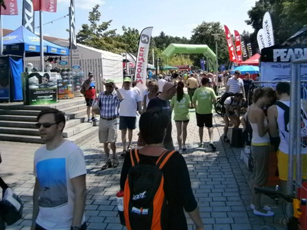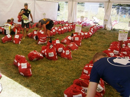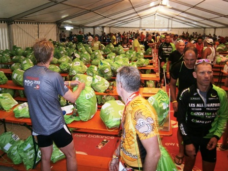 Hier erhalten die Radfahrer ihre Beutel... |