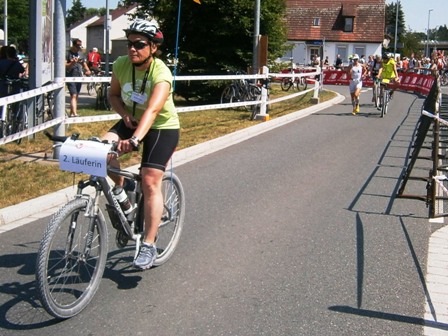 ...auf "ihren" Radfahrer. Schnell den Chip übernehmen... |