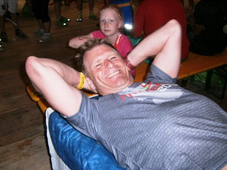 Einen Liter runtergluckern und puh, ausruhen! Und ins Zelt |