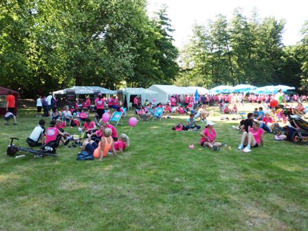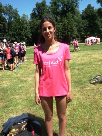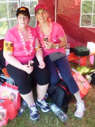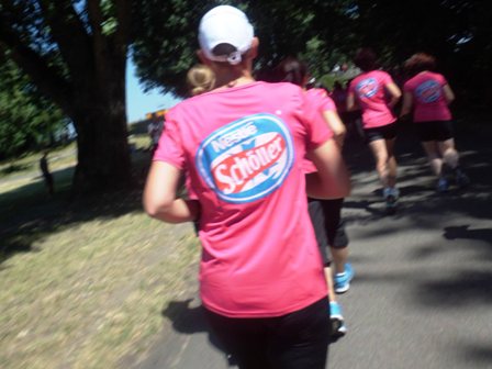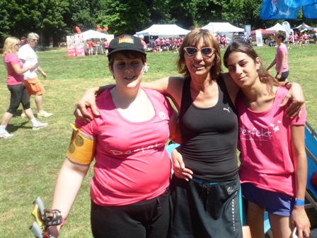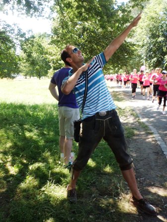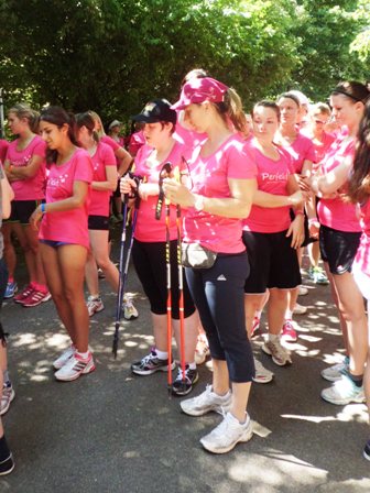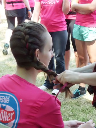 Dann gehen wir langsam Richtung Start. Upps... Tugba und ich stellen fest, dass wir kein Blinden-Band haben, so dass ich sie ordentlich führen kann. Leichte Panik... Nur jetzt nicht verlieren, bei den hunderten rosaroten Frauen? Keineswegs, denn wir wären keine taffen Mädels wenn wir nicht für alles eine Lösung hätten. Tugba zieht kurzer Hand den Bändel aus ihren Shorts: Prima, jetzt können wir uns aneinander "fesseln" und uns nicht verlieren. Jessica und Michi stehen hinten bei den Walkerinnen.