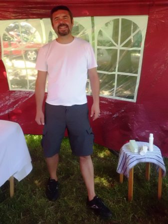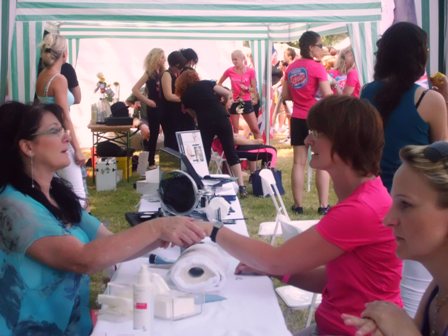 Mit unseren rosaroten Shirts "perfekt" wir sind perfekt. Wir entdecken unsere Kollegen + Mitschüler, denn das Massageteam des BBS Nürnberg ("Blindenanstalt") massiert hier, mit Cedo als Chef. Simply the Best! Wir stellen hier unsere Taschen ab, sitzen noch ein wenig im Schatten, bummeln und gucken was es für Stände gibt. Frau kann sich frisieren lassen, oder schminken, oder ne Handmassage? Und es gibt einen Schuhstand. Was für eine Freude!