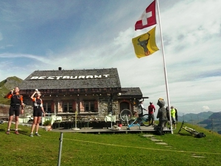 Kurze Trinkpause bevor wir die letzten Höhenmeter in Angriff nehmen (da hängt eine falsche Fahne – was macht den der Uri Stier hier in Graubünden?)