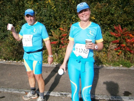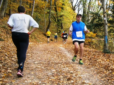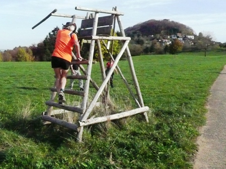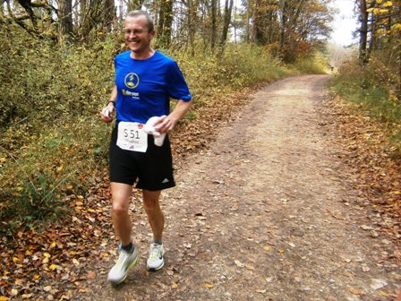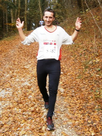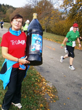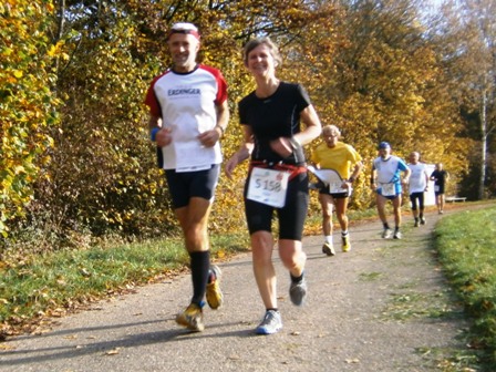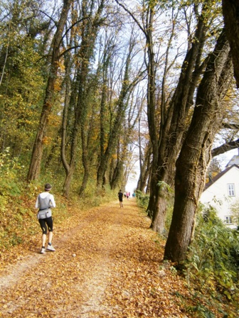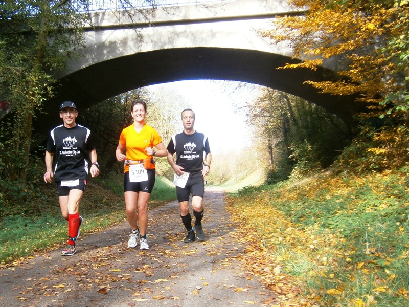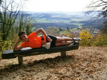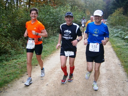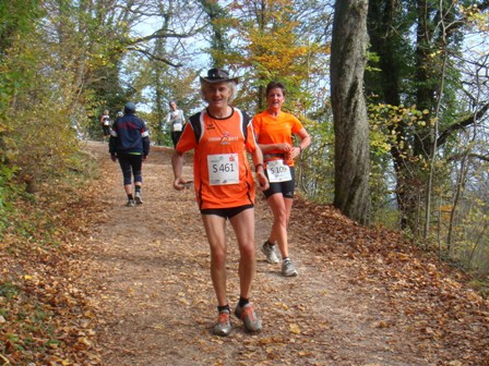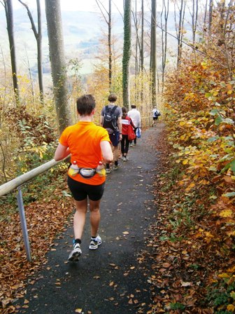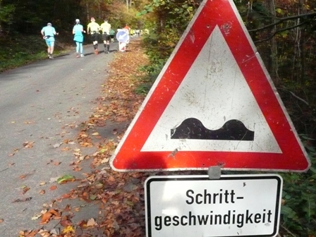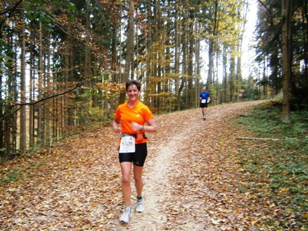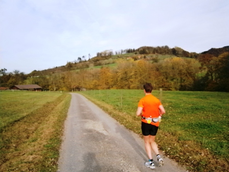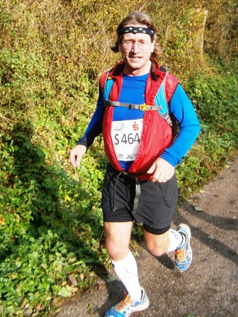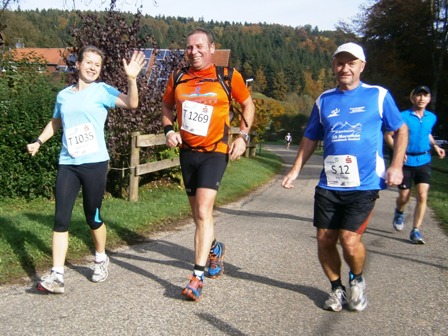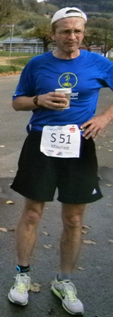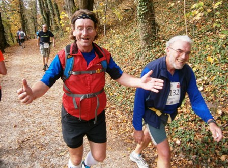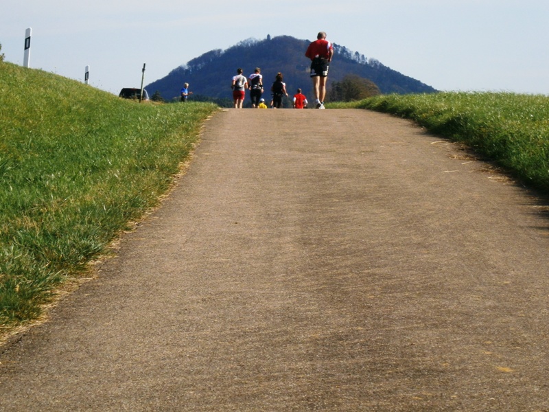 Wir starten wie immer ganz am Schluss und gehen es langsam an. Harald, Karl-Heinz und der Lionheart bremsen mich, wenn ich zu schnell bin und erzählen mir, was mich auf der Strecke erwartet (z.B. 1.070 Höhenmeter!). So kann ich mich gut drauf einstellen und die Kilometer vergehen anfangs wie im Fluge. Wir laufen immer wieder mit Leuten und kommen ins Schwatzen. An den Verpflegungsstellen nehmen wir uns Zeit. Irgendwann nach 20km sind Harald + Karl-Heinz weg. Doch auf Lionheart kann ich mich voll verlassen. So verfliegen weitere Kilometer. Ab dem 2. Berg/Hügel (km25) wird es ruhiger, da sehr viele nur die halbe Distanz machen. Jetzt sind nur noch die Ultraläufer unterwegs. Ab und zu lachen wir: "Achtung, der Schweizer-Franken-Express kommt". Unterwegs leistet mein Mitläufer auch noch dem einen oder anderen Erste Hilfe und gibt gute Tipps, z.B. Dehnen oder sogar Salsa tanzen.