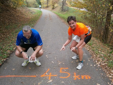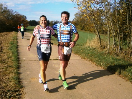 Der Albmarathon gehört zum Europa-Cup der Ultra-Marathons und soll mein 1. Ultra werden. Ich habe großen Respekt, aber mit Lionheart an meiner Seite fühle ich mich super aufgehoben. Von ihm weiß ich: "Ein Marathon ist kein Kindergeburtstag". Und ein Ultra ist ja noch weiter. Die 50km müssen gut eingeteilt werden, also langsam starten. Meine Freundin Rosie hat mir 5 große Schoko-Käfer geschenkt (die ich natürlich nicht dabei habe beim Laufen): rosa für km1-10 (man sieht noch alles durch die rosa Brille), blau für km11-20 (entspannt), grün für km21–30 (die Hoffnung), orange für km31–40 (da wird es schon langsam kritisch) und rot für km41–50 (im roten Bereich?). Unterwegs denke ich alle 10km an den dazugehörigen Käfer.
