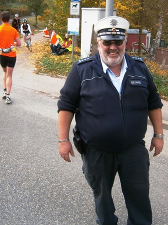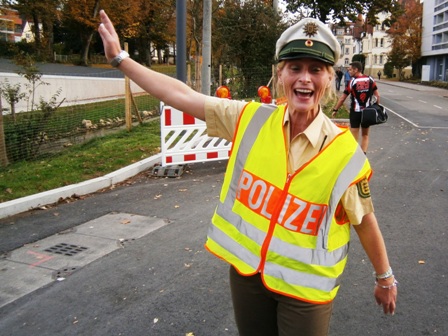 Die superfröhliche Polizistin jubelt uns auf die letzten 200m