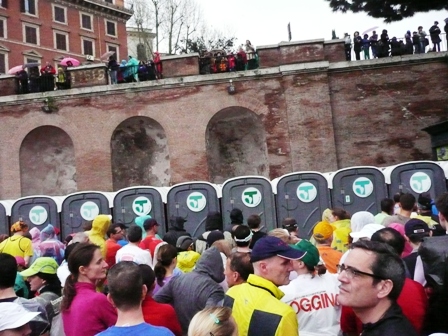Duschen will ich nach dem Lauf und nicht schon jetzt. Die meisten Läufer sind bis in die Unterwäsche und Schuhe pitsche nass. Rom habe ich mir anders vorgestellt