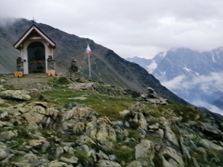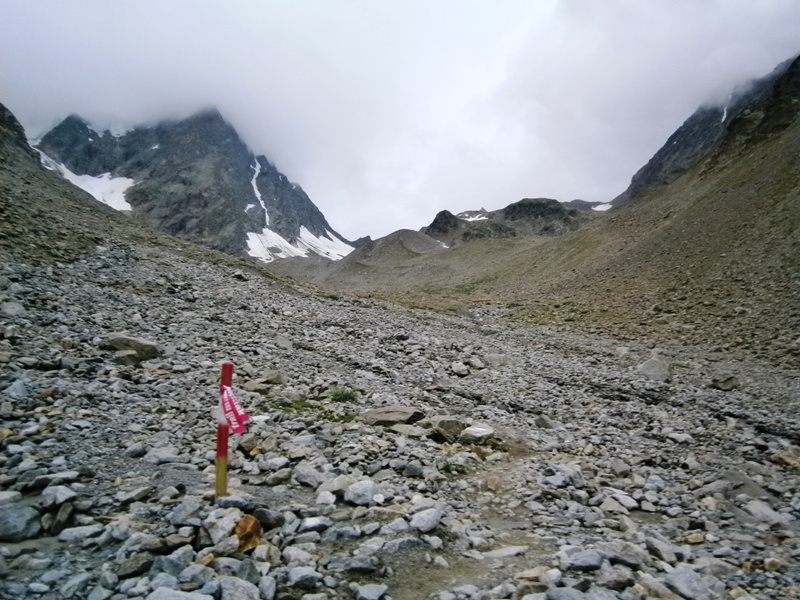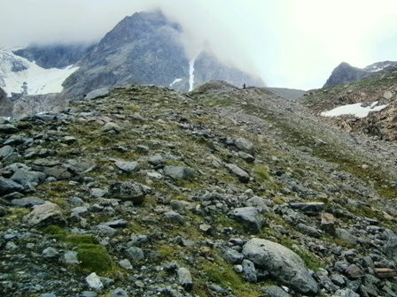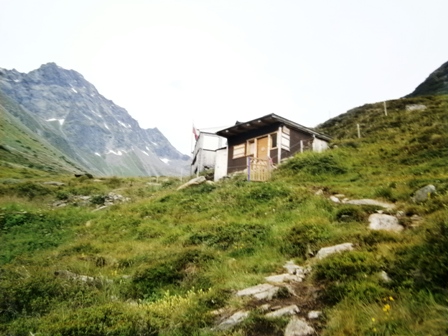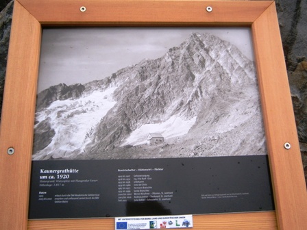 2.800m: Erster Schneekontakt (oben die Kaunergrat-Hütte)
