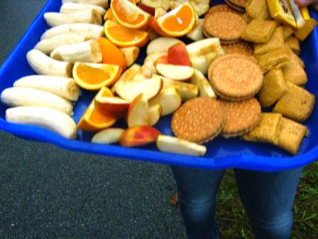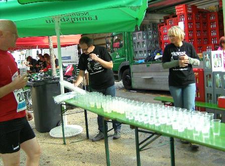 Nachdem ich durch das Ziel gehoppelt bin, kann ich mich stärken mit frischem Obst, kühlen Getränken und genieße die stimmungsvolle Atmosphäre im toll organisierten Zielbereich. Weil es aber immer wieder regnet und ich langsam auskühle mache mich auf den Heimweg.
