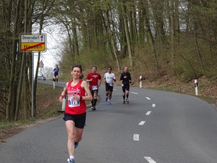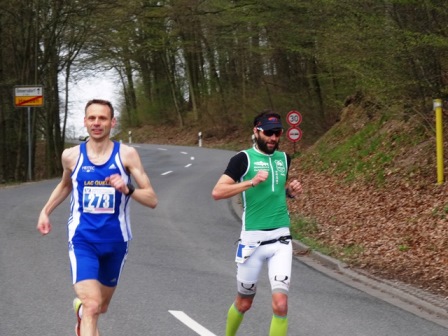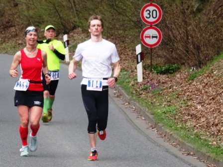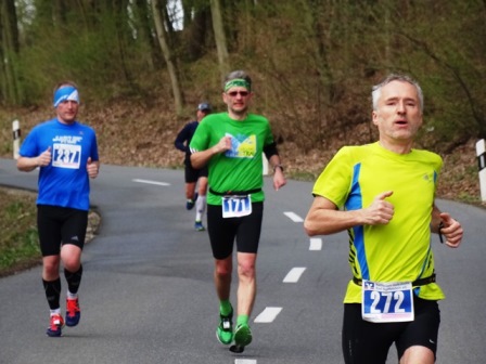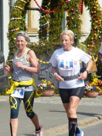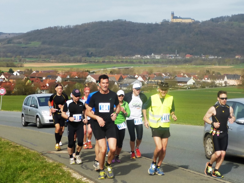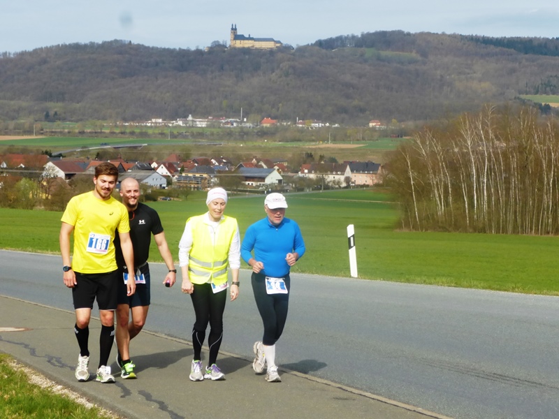 Zuerst starten wir Marathonläufer, danach die Halbmarathonis. Nach 4km geht es auf breitem Radweg bergauf (Kloster Banz), d.h. 1km gehen. Dann auf der Strasse wieder runter, über den Main und auf Radwegen + Strasse bei km 14 wieder rauf (Basilika Vierzehnheiligen). Auch hier ist 1km zu gehen. - Der dritte und letzte Anstieg geht auf den Staffelberg: Superschöne weite Aussicht, exakt die Hälfte ist vorbei. Danach geht es nur noch bergab, zieht sich jedoch... Eine sehr gute Einteilung ist gefragt!