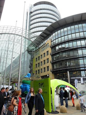 Trockenen Fußes im Ziel angelangt flüchte ich mich vor dem Regenguss auf die Tribüne, von der man einen guten Blick auf das Zielgelände hat