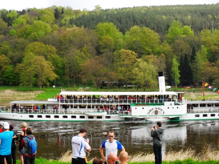 Während wir uns in Richtung Start aufmachen, legt das Dampfschiff ab und fährt zunächst ein kleines Stück flussaufwärts, um dann zu wenden und pünktlich mit dem Startschuss neben uns nach Dresden zu fahren