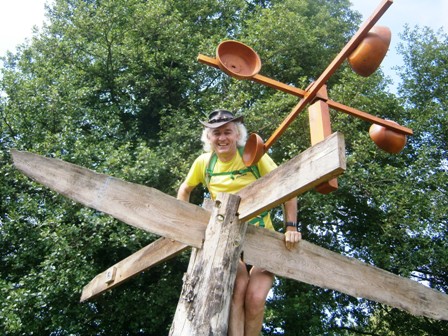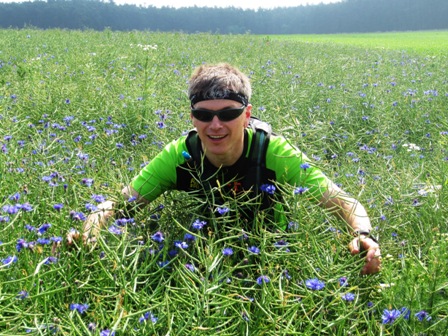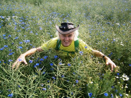 eine bunte Wiese. Der Mann mit Hut klärt mich über die Meditation auf.