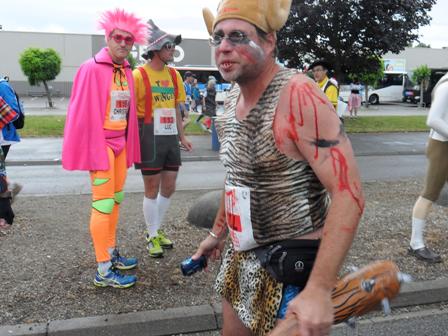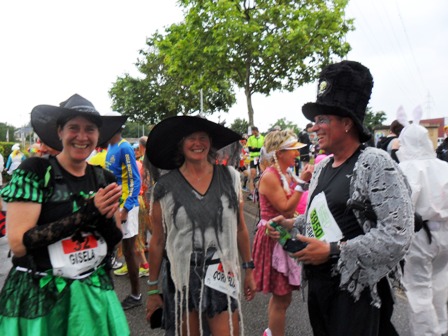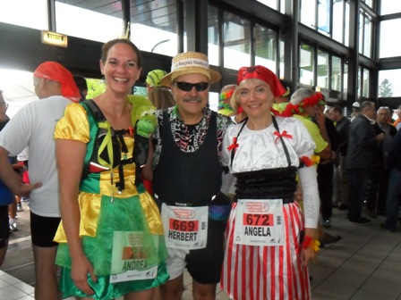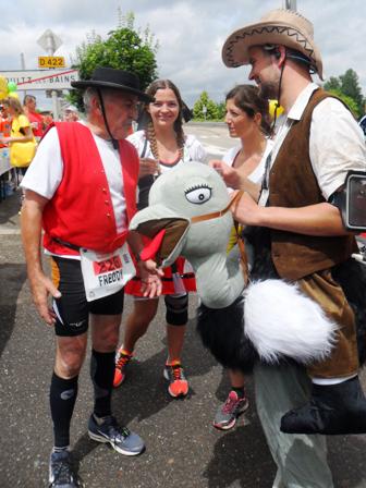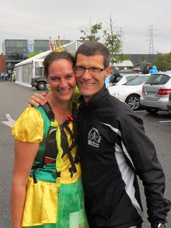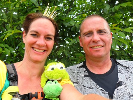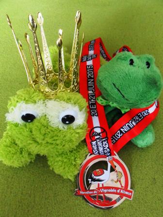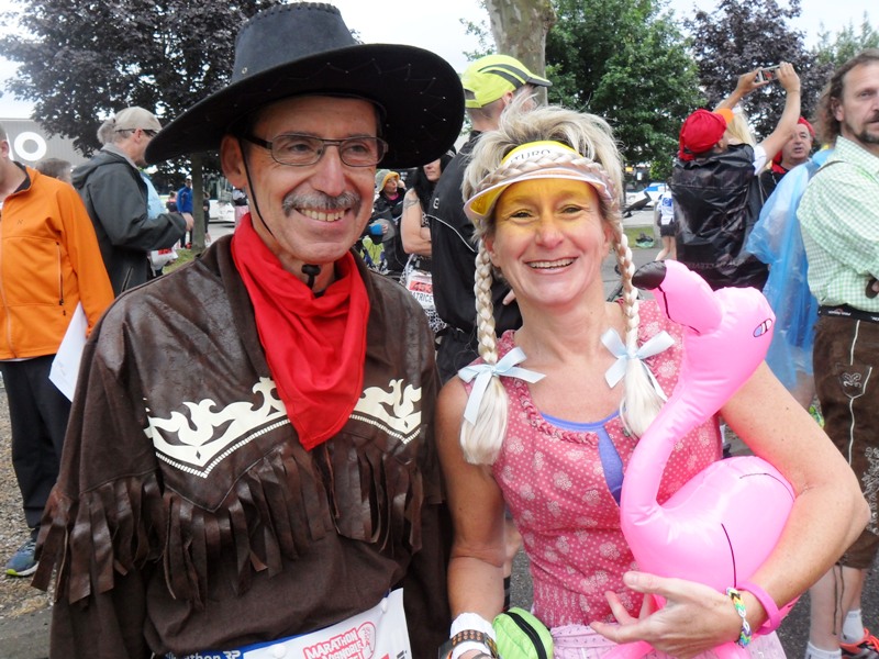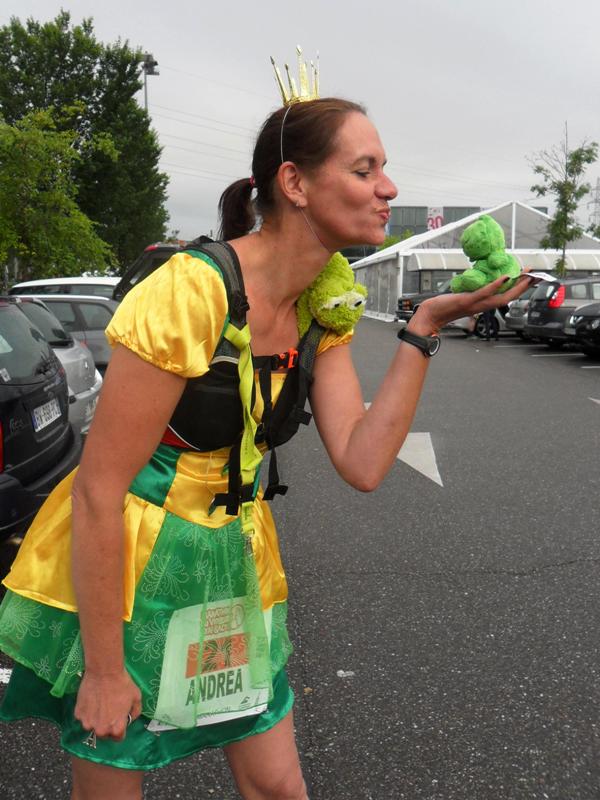 Nützliche Info: In Frankreich braucht man zum Marathon-Start ein Arzt-Attest. - Heute gehe ich als Froschkönigin an den Start – denn jede Verkleidung wird im Ziel mit einem Extra-Geschenk belohnt. Ich küsse schnell noch „Max“ – doch er weigert sich standhaft sich in einen Prinzen zu verwandeln.