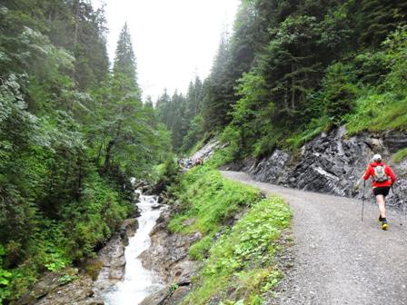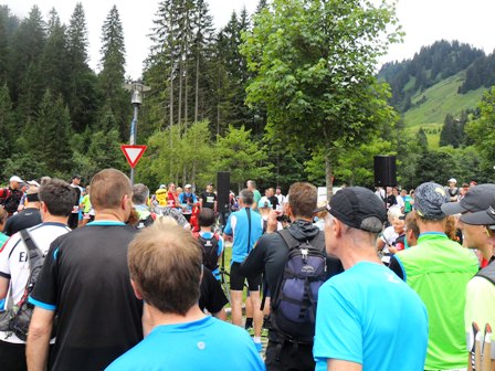 Die Ultra-Läufer der 65km-Variante starten bereits um 06.00 Uhr, im Regen am Gemeindeplatz in Riezlern. Sie laufen über Gottesacker-Plateau, Hohen Ifen und Walmendinger Horn, bevor sie nach Baad kommen, wo wir zur kurzen Variante starten.