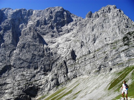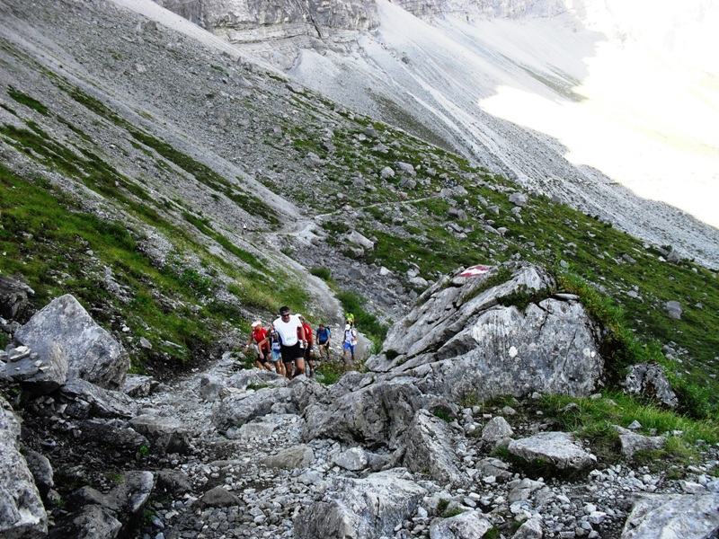 Manchmal ging es nur in kleinen Schritten vorwärts, im Geröll oder bei steilen Anstiegen. Und in der Höhenluft wird die Puste manchmal knapp. Es gibt nichts zu verbessern hier, der Karwendelmarsch ist perfekt. Danke allen engagierten Helfern, Ihr wart lustig und immer sehr hilfsbereit! Danke auch für die guten Bio-Produkte unterwegs und im Ziel (Holundersaft, Käse, Salami und ganz besonders die Heidelbeersuppe).